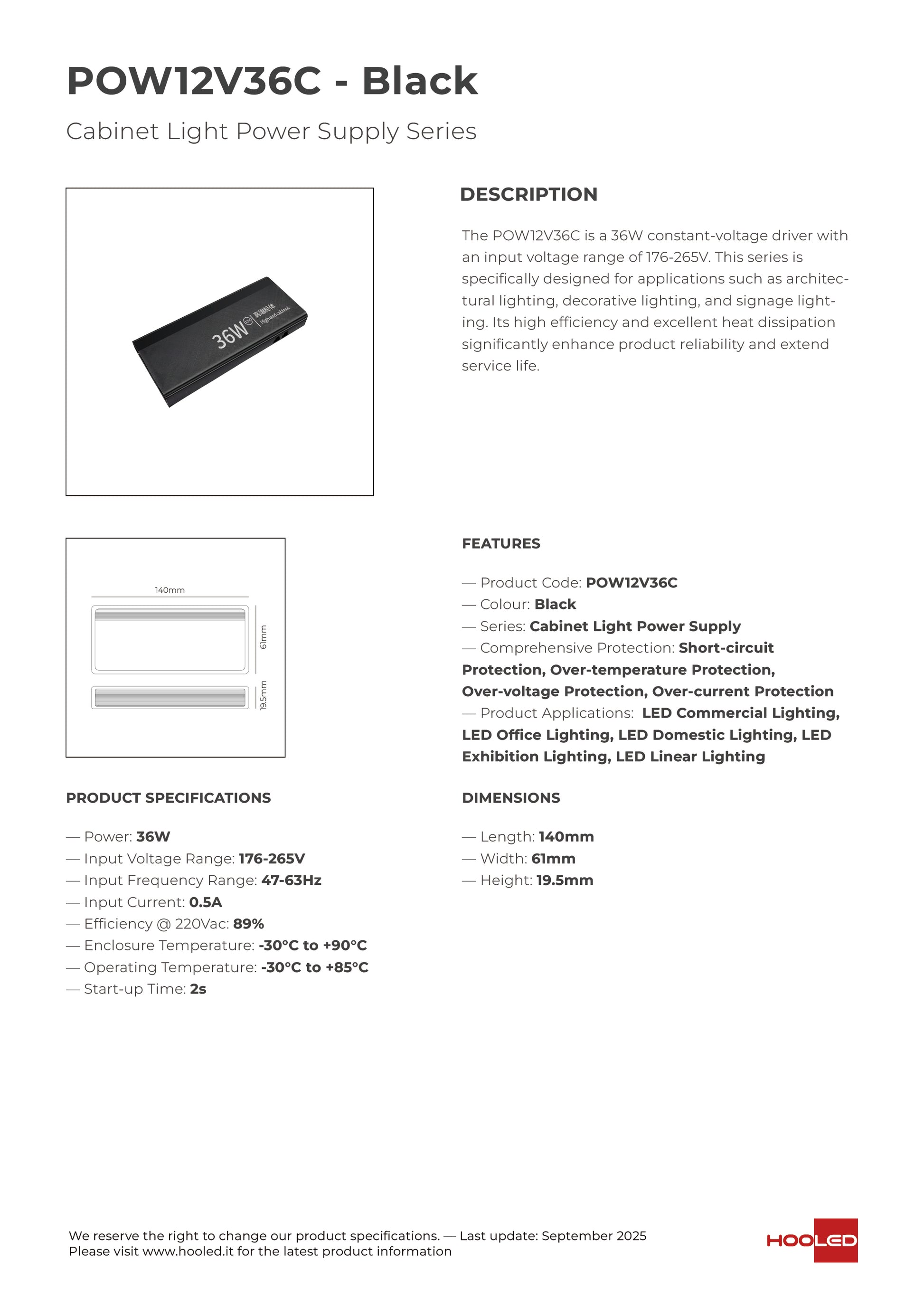 The POW12V36C is a 36W constant-voltage driver with an input voltage range of 176-265V. This series is specifically designed for applications such as architectural lighting, decorative lighting, and signage lighting. Its high efficiency and excellent heat dissipation significantly enhance product reliability and extend service life.